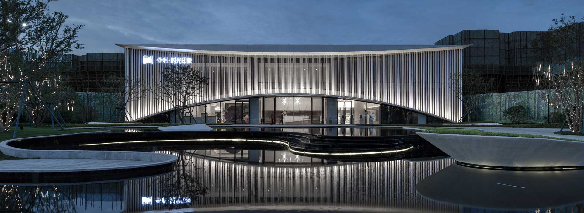 售樓處以簡潔優(yōu)雅的形體配以流動(dòng)的幕墻,形成輕盈、優(yōu)美的造型。流動(dòng)的幕墻如海絲之路的水波,弧形入口在鏡面水景的倒影下,猶如一輪旭日莊嚴(yán)地從水波漣漣、亮光熠熠的海面上升起,寓意“日出東方”。金色的豎向線條,猶如翻滾的波浪,名為“海絲之路”的畫卷就此展開。