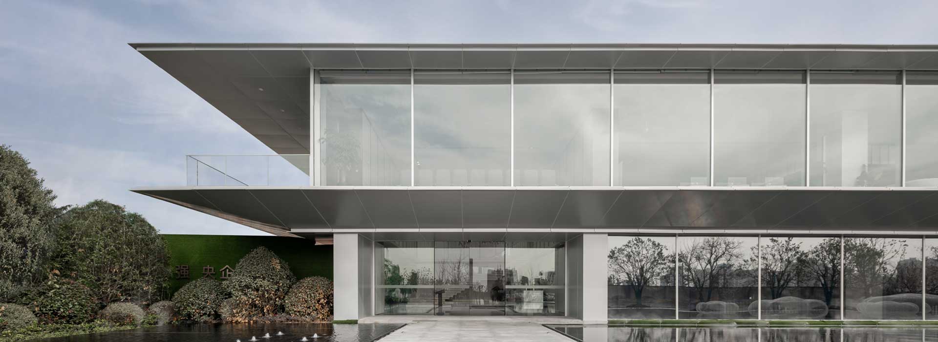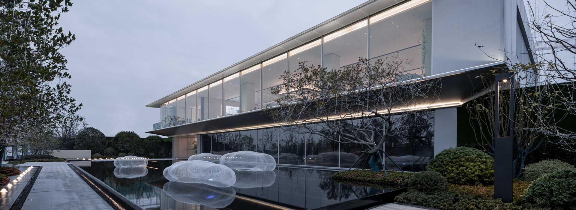 因場地的局限性,設(shè)計中我們以“隱逸東方”為設(shè)計出發(fā)點,首選鋁板和玻璃作為建筑的主體材料,通過材料的特性弱化建筑的體量感,同時采用坡屋頂出檐的建筑形式呼應(yīng)當?shù)氐谋就廖幕?,建筑主色調(diào)以灰色系為主。