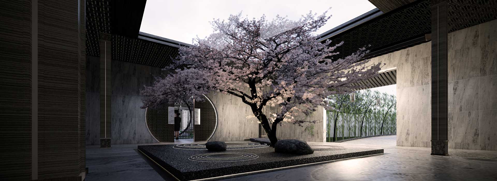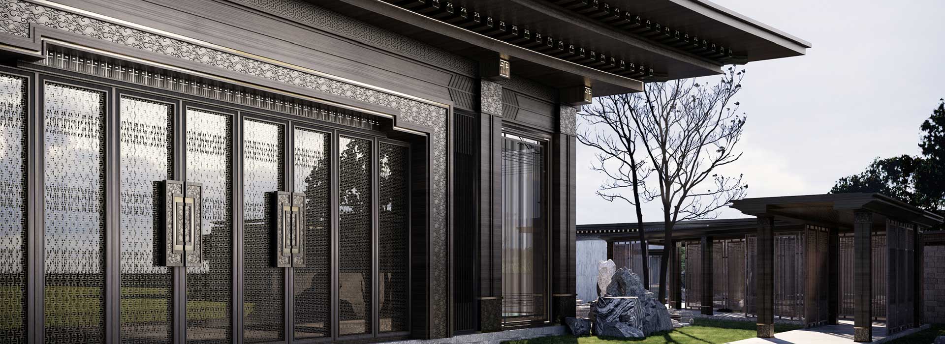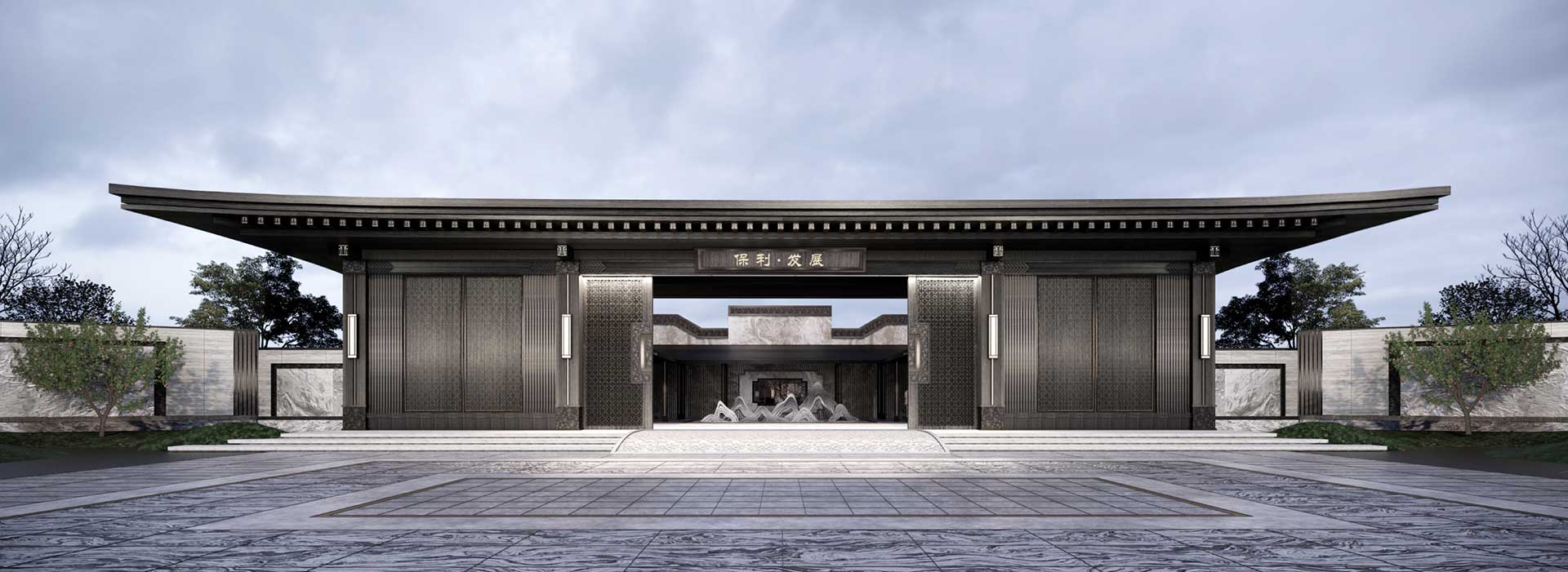 展示區(qū)設(shè)計(jì)從城市歷史文脈入手,彰顯齊風(fēng)雅韻,布局方式兼具北方園林的對(duì)稱中正與南方園林的曲折縈繞,營造五重院落空間,結(jié)合臨淄八景意向,在有限的場(chǎng)地條件內(nèi)創(chuàng)造無限的空間體驗(yàn)。建筑單體設(shè)計(jì)取意于淄博傳統(tǒng)建筑形制,細(xì)節(jié)之處融入戰(zhàn)國時(shí)齊國瓦當(dāng)藝術(shù)中最具代表的圖案符號(hào),通過中魂西技的手法,展現(xiàn)項(xiàng)目的在地性。