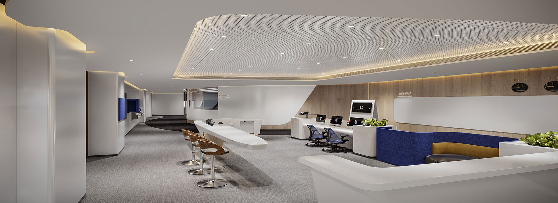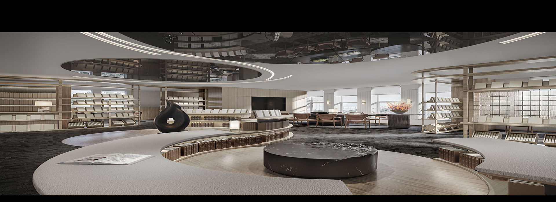 項目以“經(jīng)緯”作為主題,寓意建行大學為經(jīng)緯的殿堂,吸納經(jīng)緯之才,終成經(jīng)緯之巔。前廳利用弧形敘述出“歡迎”與“書卷”的設計語言,將“經(jīng)緯”融入前廳背景中,并將建行大學第一所學院的經(jīng)緯度設計進前臺造型里。天花提取經(jīng)緯層疊及懷表精細的意識形態(tài),演變成功能與形式相輔相成的造型,使空間在視覺上得到延展。圖書館長廊采用穿透,陣列,充滿儀式感的陳列方式,從細微處體現(xiàn)空間的趣味與品質(zhì)。