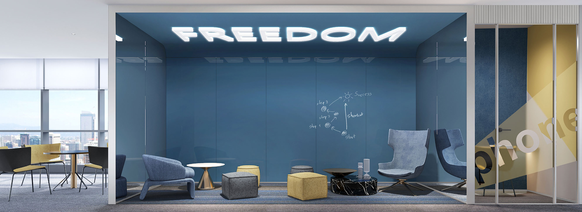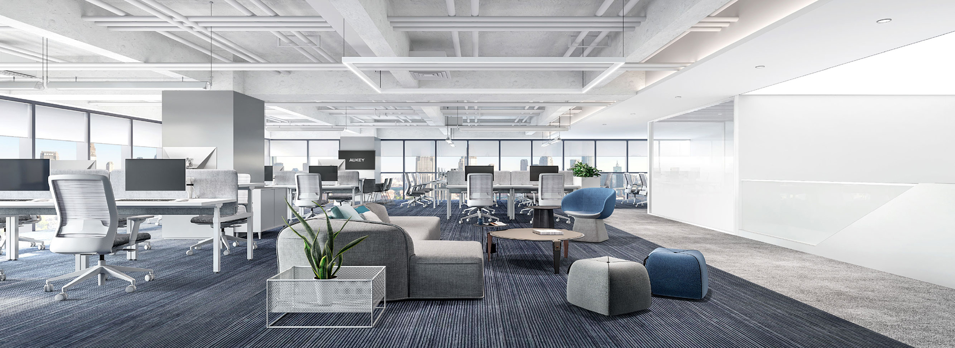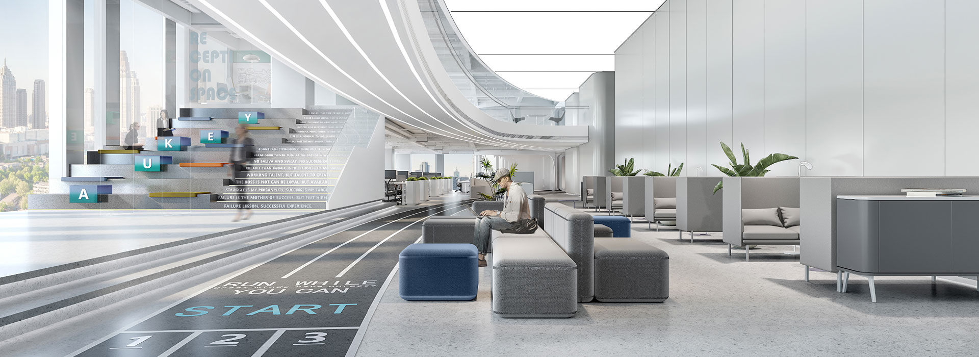 項(xiàng)目以企業(yè)文化為支點(diǎn),將科技感、未來感和人性化設(shè)計(jì)融入辦公空間中。以大膽簡潔的體塊感、流線感設(shè)計(jì),在變化中體現(xiàn)一種面向未來的張力。項(xiàng)目同時(shí)打破了空間的界限,引入“跑道”概念,開放式的工作區(qū)設(shè)計(jì)增進(jìn)了空間的交互,讓整個(gè)空間的功能實(shí)現(xiàn)了多元化和共享化,員工之間的交流與互動因此變得更加順暢。