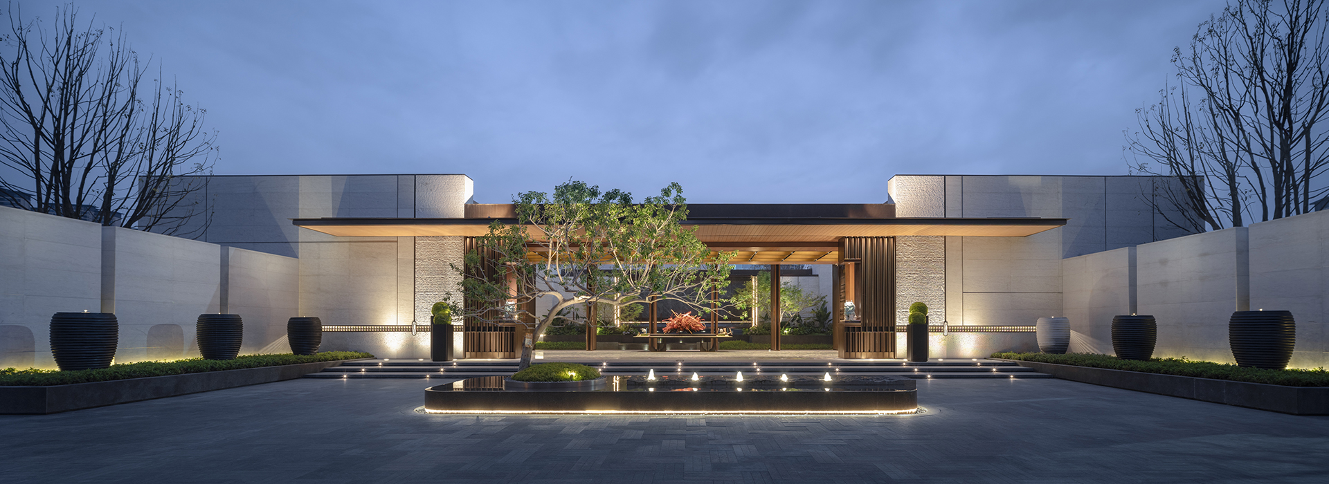 在項目整體打造的概念上將規(guī)劃市政路作為前區(qū)引導(dǎo)空間,把市政公園一并納入展示區(qū)打造范圍,醞釀曲徑通幽與豁然開朗的氛圍感。多感官研究視角的引入成為設(shè)計立意與手法,是模擬自然的形態(tài)與沉浸其中的身體感受,通過橫向片墻與縱向片墻的高差起伏,圍合出“園”的空間意向,空間體驗舒適而自然。